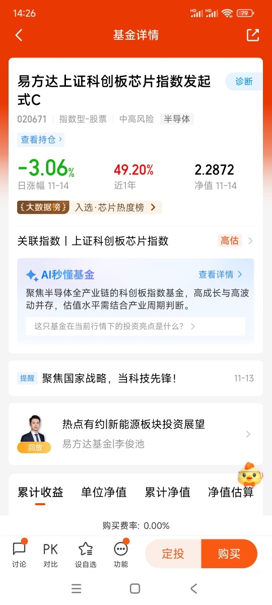 第二天打卡,今天休市,回顾11月14日,芯片板块下跌,$易方达上证科创板芯片指数发起式C$ 跌3.06%,科创芯片为什么要暴跌?今年9月初的时候,科创芯片指数年内涨幅一度冲到80%,有些个股的市盈率都超过300倍,估值早就透支了未来的业绩预期。