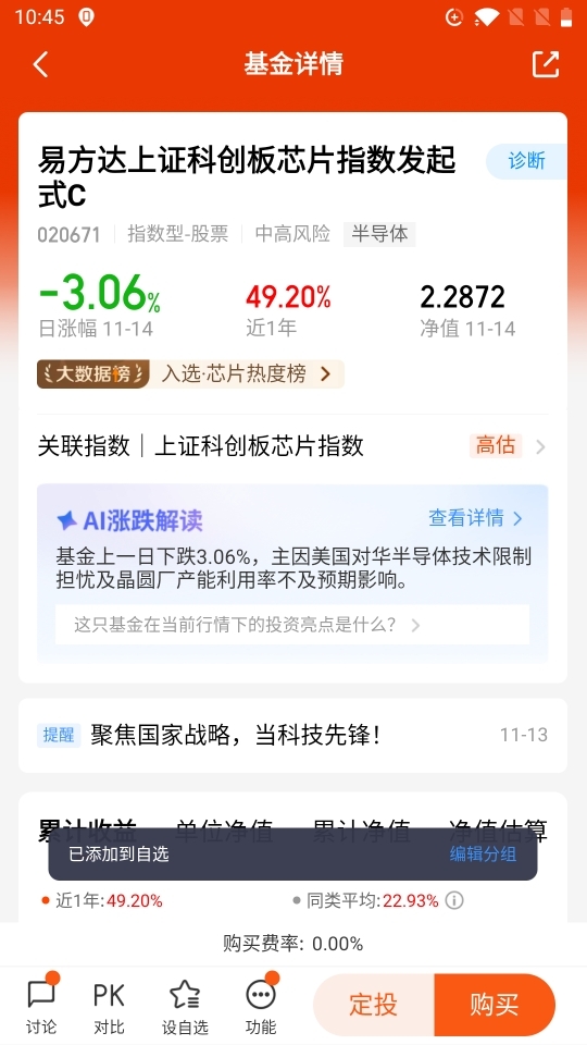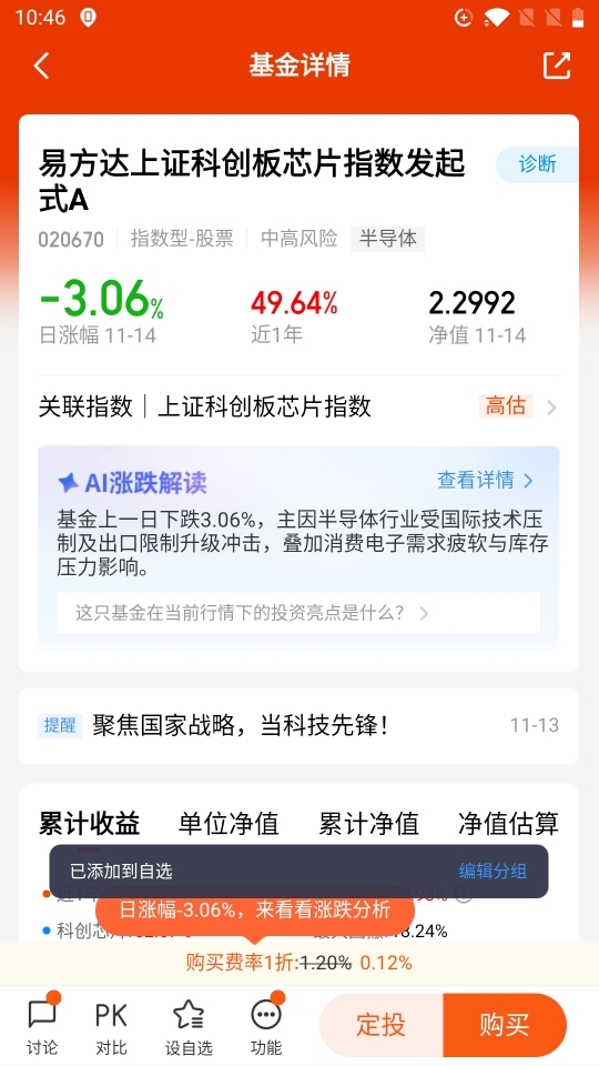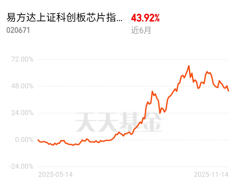 $易方达上证科创板芯片指数发起式C$ 最新净值下跌3.06%,近一月回撤5.17%,短期调整较为显著。该基金聚焦科创板芯片龙头,前十大重仓股包括海光信息、澜起科技、中芯国际等硬科技企业。近期市场波动中,华为宣布将于11月21日发布AI突破性技术,可将算力资源利用率从行业平均30%-40%提升至70%,同时英伟达即将公布财报,两大事件形成国产替代与外部供给的双重催化。存储芯片已进入新一轮涨价周期,海内外巨头持续加码AI算力研发,在AI产业利好驱动下,芯片板块中长期景气度依然向好。本次回调或为投资者提供了布局科创芯片领域的较好时机。