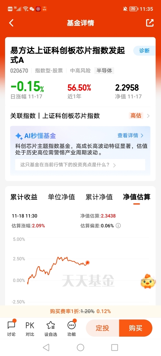 #观点搭子团火热招募中!# #热点话茬# 11月18日打卡第五天,周二芯片目前涨幅2%+,我选择持仓不动,今天行情跌多涨少,半导体产业领涨电池领跌,$易方达上证科创板芯片指数发起式C$ 目前净值估算涨了2%+,但相比前期调整来说,我的持仓还在浮亏中,好在今天的反弹给我增加了信心,继续潜伏科创芯片等待大涨,我今天暂定不操作买卖。@易方达基金