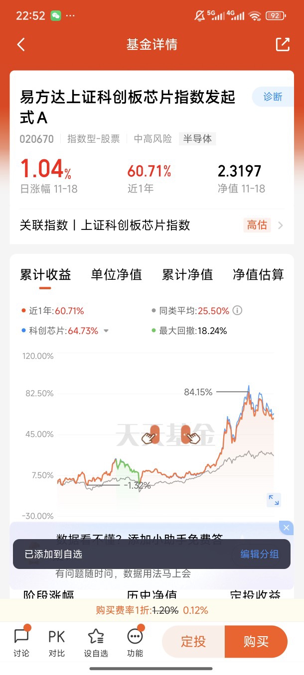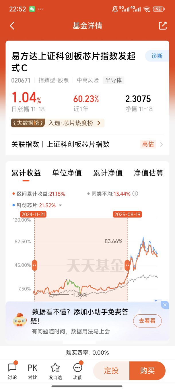 #观点搭子团火热招募中!# #热点话茬# 11月18日,今日芯片板块延续近期活跃态势,易方达上证科创板芯片指数C日涨幅达1.04%,近1年收益更是突破60%,表现相当亮眼。不过关联的上证科创板芯片指数当前处于“高估”区间,加上板块短期波动本来就大,后续可能会有回调风险。作为高风险偏好的配置工具,这只基金适合长期看好半导体产业链的投资者,但建议别追高,逢低布局会更稳妥。$易方达上证科创板芯片指数发起式C$ @易方达基金