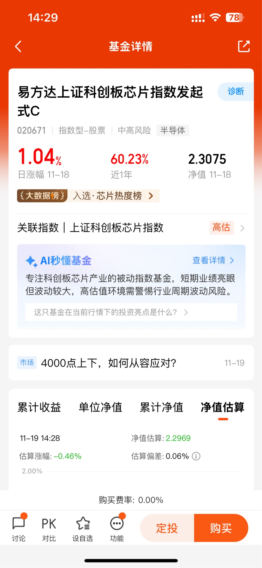 $易方达上证科创板芯片指数发起式C$今天盯着易方达上证科创板芯片指数C,截至午盘