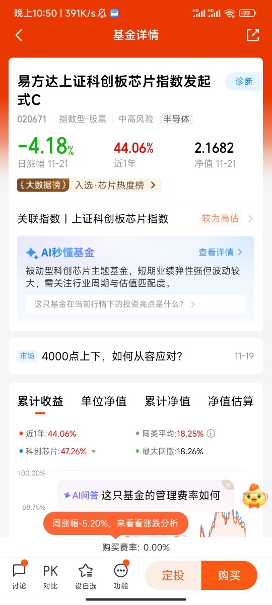 11月22日,周末休市。$易方达上证科创板芯片指数发起式C$近一周下跌5.20%