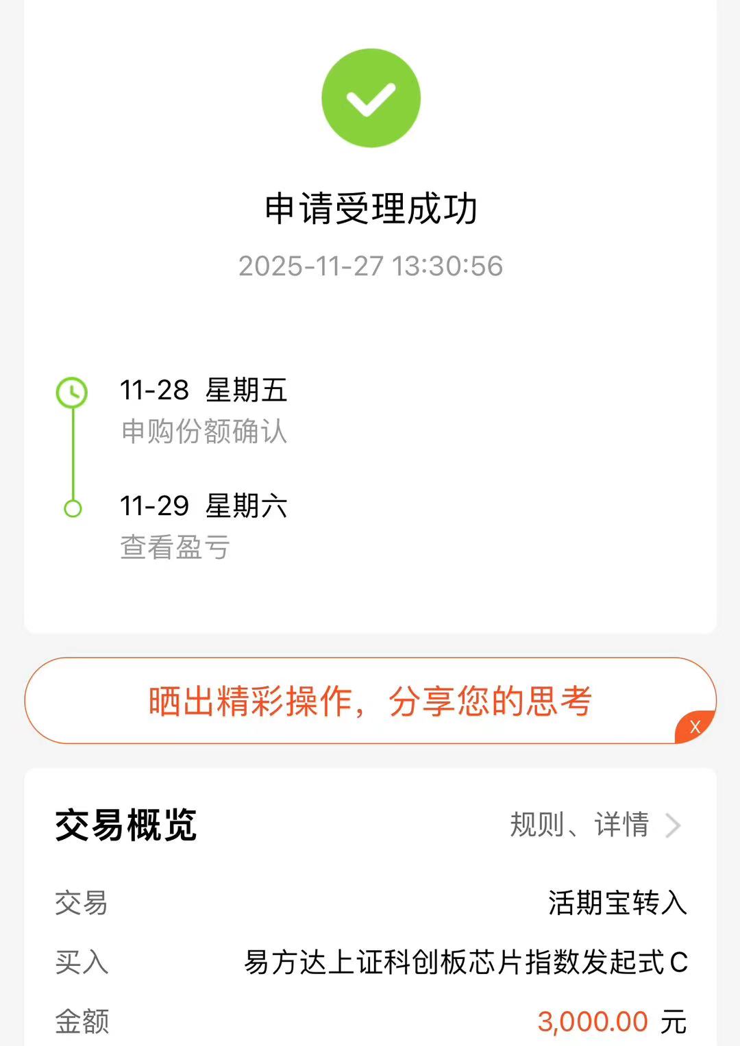 今天继续关注科创芯片方向,板块整体维持强势震荡格局,龙头设备、设计、材料环节都有资金在低位悄悄布局。短期看,行情仍在反复打磨底部,但利好在于产业催化密集、政策支持明确,市场对科创芯片的风险偏好正在回升。中长期来看,AI 算力、先进制程国产化、自主可控需求都在强化行业景气度。趁着回踩企稳,我今天继续加仓 3000 元,保持节奏,等待趋势进一步打开。