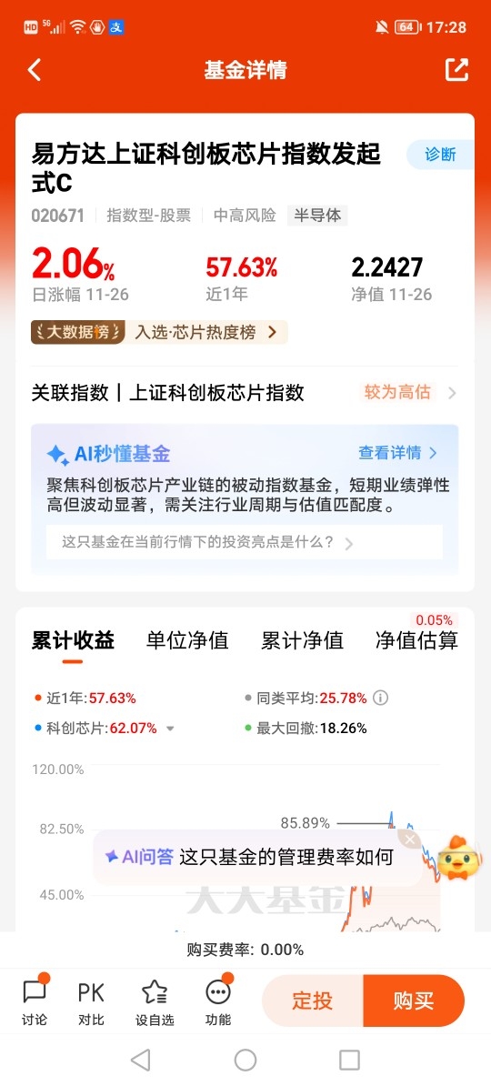 #观点搭子团火热招募中!# #热点话茬# 11月27日打卡第十四天,周四芯片涨一点点,今天继续按兵不动。上午一度芯片长势可人,下午临近收盘大幅跳水,现在市场还没有企稳,观望情绪浓厚,所以谨慎投资为主,今天没有加减仓操作,上周五大跌历历在目,这周五会不会继续走跌,明天就知道了,没有企稳之前,一切操作都减缓,长期看科技依然是最强主线,短期看科技不同程度都是大回调,慢慢来吧!@易方达基金