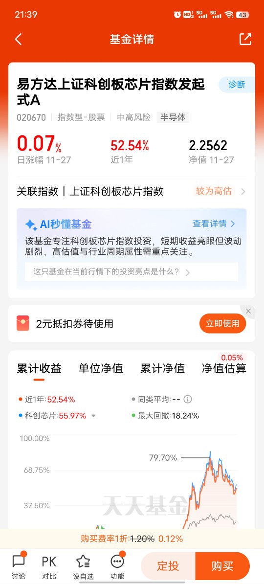 11月27日,今日芯片指数微涨,本周已连涨四天。$易方达上证科创板芯片指数发起式
