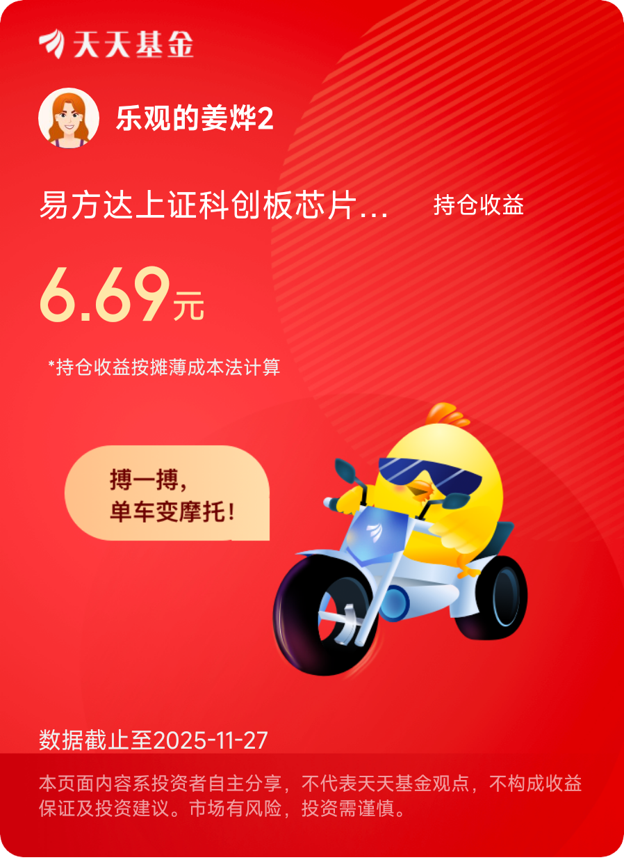 11月27日,第十二天打卡发帖,今日科创芯片表现不错,$易方达上证科创板芯片指数发起式C$ 涨0.07%,虽然只涨了0.07%,但亮点藏不住,寒武纪、中芯国际这些龙头还能逆势微涨,国产替代的节奏没停,设备材料领域的自主化率也在稳步提升,加上全天700多亿的成交额,说明资金对芯片赛道的关注度没降 。毕竟现在AI算力需求还在爆发,新能源车对芯片的需求也越来越大,长期逻辑没毛病,短期波动只是资金在“互相试探”而已。@易方达基金 #晒收益##晒收益#