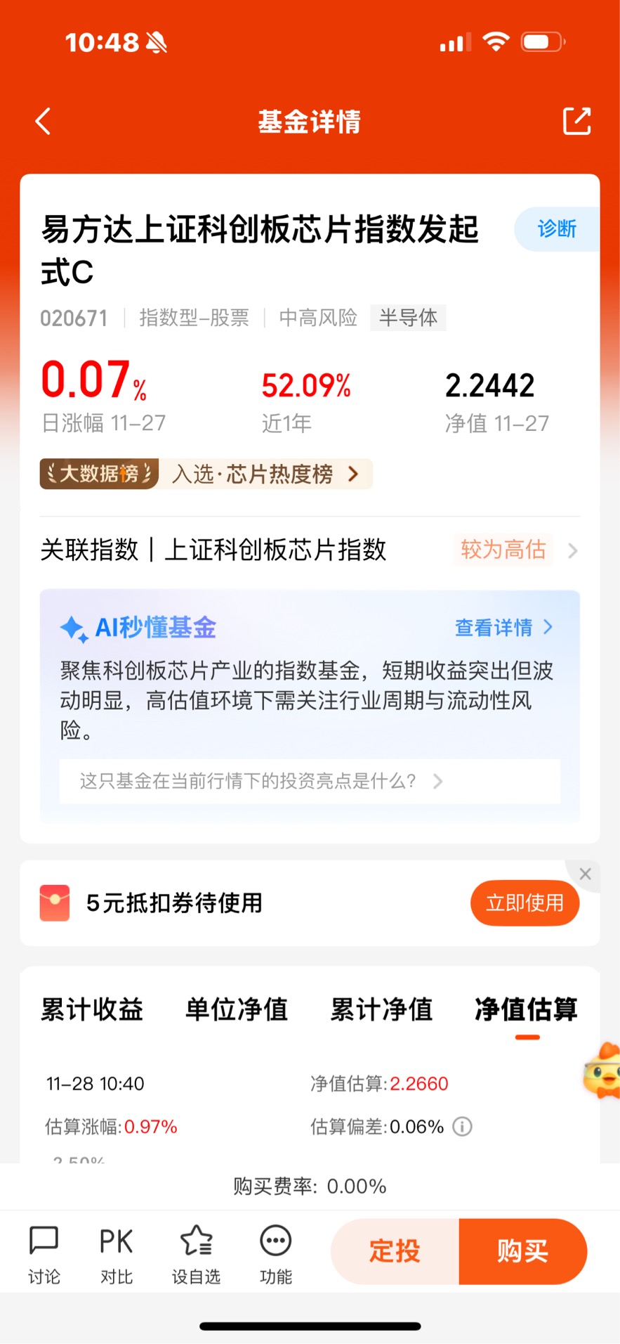 11月27日,易方达上证科创板芯片指数发起式C当日净值涨0.07%至2.2442,板块呈现“冲高回落、成分股分化”特征,海光信息、中科蓝讯等涨幅超8%领涨。