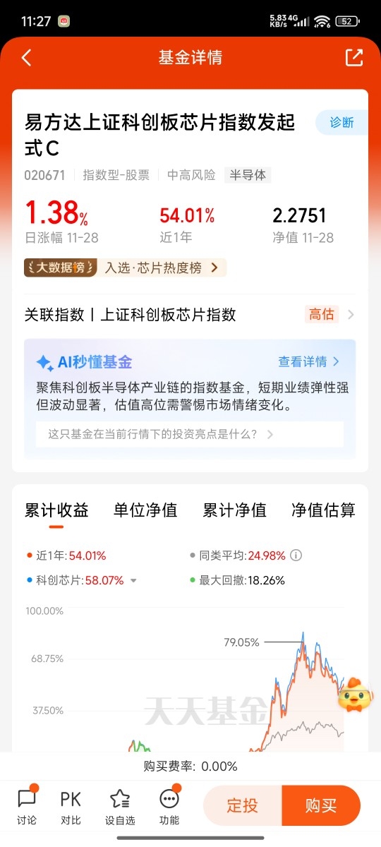 今日A股市场暖意融融,而芯片板块尤如晨曦破晓,光芒初现。截至11月28日收盘,科创50指数大涨1.26%,收于1327.15点,成为全场最亮眼的科技风向标。作为聚焦“硬科技”核心资产的代表,上证科创板芯片指数亦同步走强,带动相关基金如易方达上证科创板芯片指数发起式C(代码:017479)水涨船高。