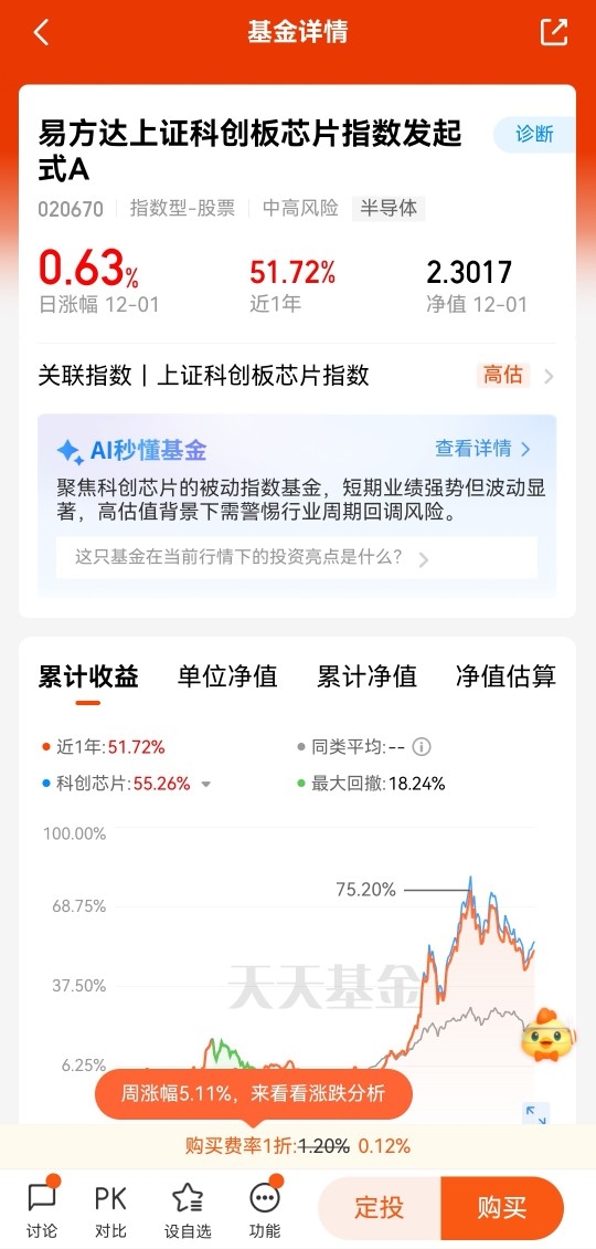 12月1日,科创芯片指数收+0.66%,$易方达上证科创板芯片指数发起式C$收+