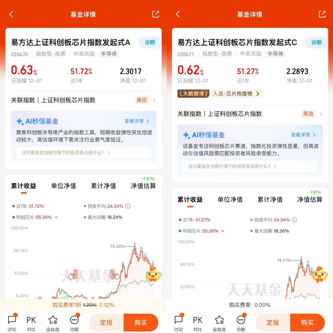 不过呢,投资也有风险,芯片行业技术更新换代快,竞争激烈,市场波动也比较大。这只基金的净值可能会随着指数的波动而起伏,大家要有心理准备。总的来说,如果你看好芯片产业的长期发展,并且能接受一定的投资风险,无论是上证科创板芯片指数,还是易方达上证科创板芯片指数发起式 C 基金,都可以纳入投资考量范围。但投资前一定要结合自己的风险承受能力和投资目标,谨慎做出决策!@易方达基金 $易方达上证科创板芯片指数发起式C(OTCFUND|020671)$
