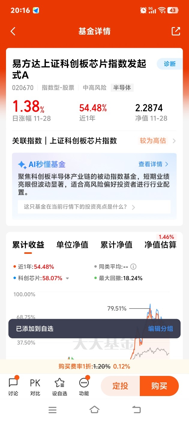 12月2日,$易方达上证科创板芯片指数发起式C$(020671)随板块同步震荡回
