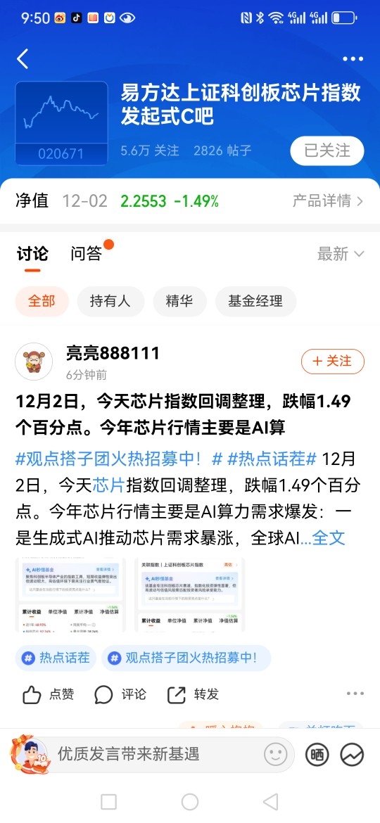 #观点搭子团火热招募中!# #热点话茬# 12月2日,今日芯片指数震荡调整,收盘下跌1.49%,走势上看后市还有望继续反弹。可以说,科创芯片作为中国芯片产业的重要组成部分,不仅在技术上不断取得突破,还在市场表现上展现出强劲的弹性。在政策支持和技术驱动的双重作用下,科创芯片企业有望在未来的市场竞争中占据重要地位,可以重点关注。