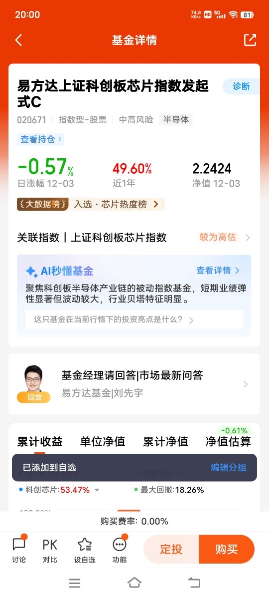 #观点搭子团火热招募中!# #热点话茬# 12月3日,$易方达上证科创板芯片指数发起式C$ 对应跟踪的科创芯片指数当日下跌0.61%,而该基金前一交易日(12月2日)净值已下跌1.49%,短期受科技板块震荡影响明显 。从业绩表现看,基金近一月收益-5.73%,但成立以来收益达125.53%,长期成长属性未改。当前市场处于年底资金结算期,科技板块受获利了结影响波动加剧,但宏观层面流动性宽松,且政策持续聚焦科技创新。半导体板块前期调整已消化部分估值,叠加国产替代进程加速,短期震荡不改长期趋势,后续随着资金布局回暖,有望逐步企稳回升。@易方达基金