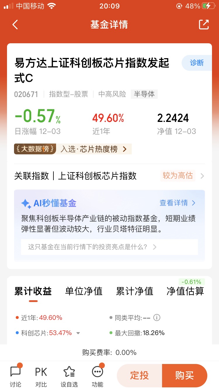 #观点搭子团火热招募中!# #热点话茬# 12月3日第3篇,本月我计划用月结余的25%分两次布局$易方达上证科创板芯片指数发起式C(020671)$,首次投60%,若遇板块回调3%以上再补剩余40%。理由是我持有的易方达标普信息科技指数A聚焦海外科技龙头,而该基金可补全国内芯片自主替代赛道,形成海内外科技配置互补。逻辑上,大基金三期落地提供资金支撑,存储芯片涨价带动行业景气度回升,当前板块估值合理;C类免申购费,持有超7天免赎回费,适配本月灵活布局需求。@易方达基金