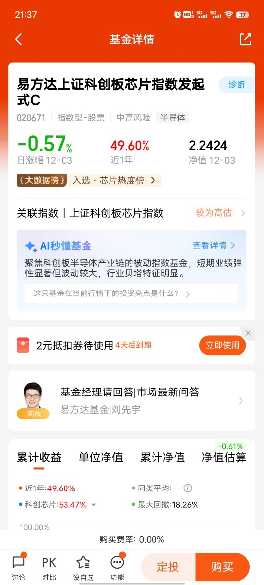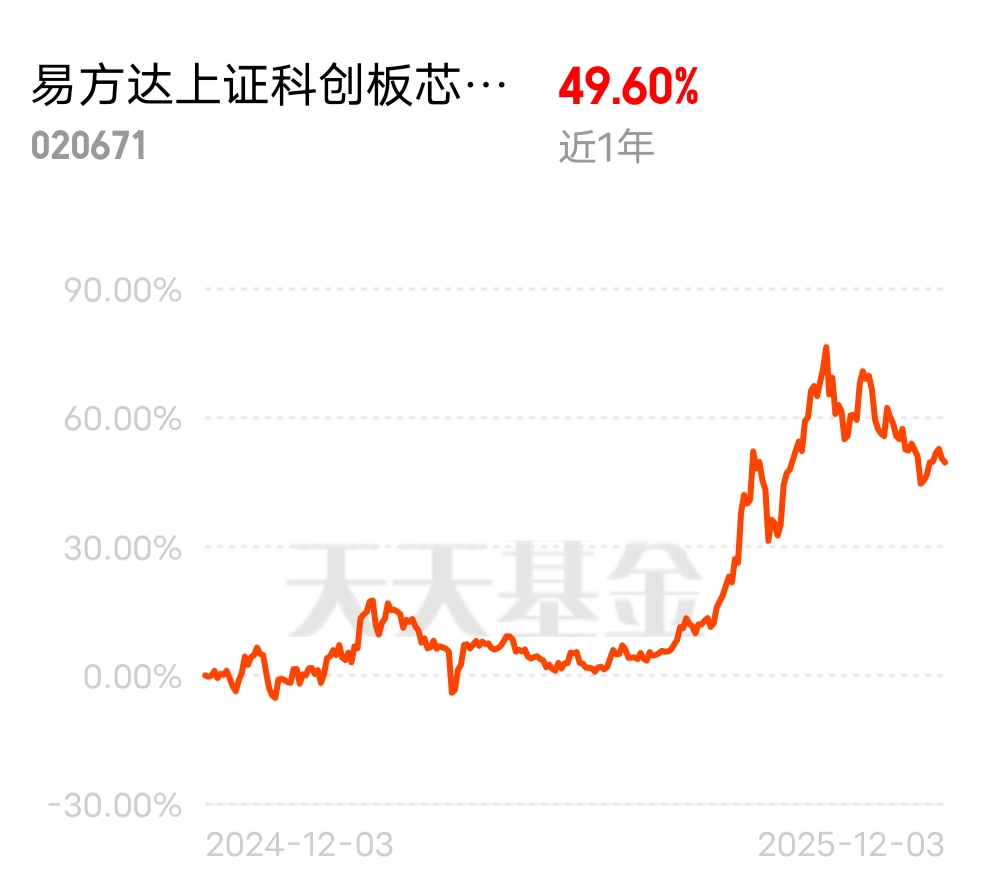 12月3日,今日芯片指数下跌,$易方达上证科创板芯片指数发起式C$今天下跌0.5