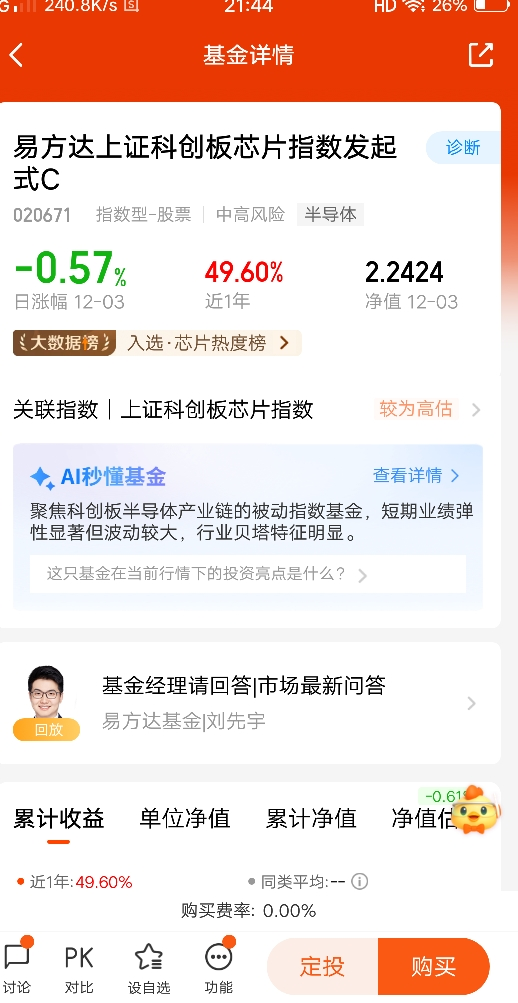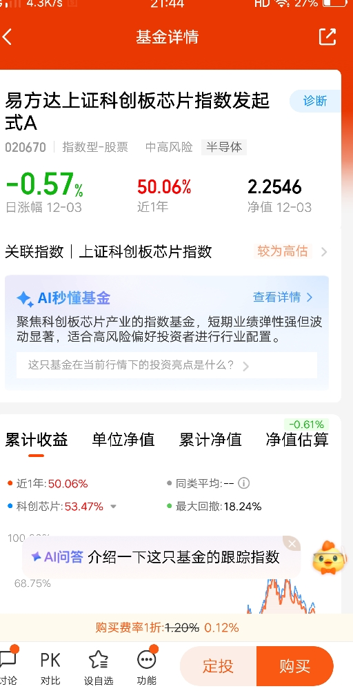 12月3日,芯片指数下跌。已经连跌两天。A股三大指数今日集体回调,沪指跌0.51%,深证成指跌0.78%,创业板指跌1.12%。行业板块涨少跌多,煤炭行业、风电设备、中药板块涨幅居前。$易方达上证科创板芯片指数发起式C$ @易方达基金