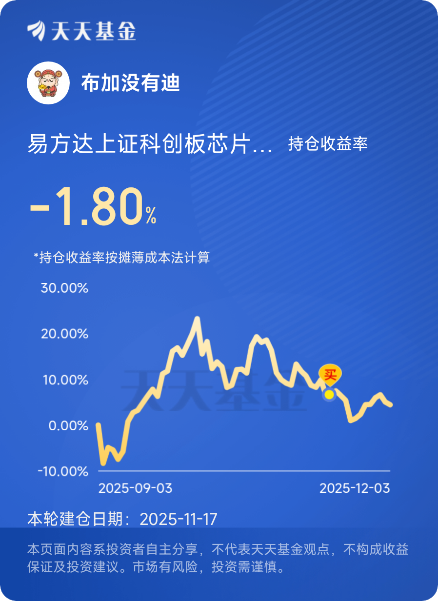 国产芯片产业正迎政策护航与国产替代的双重风口,硬科技成长逻辑清晰,而易方达上证科创板芯片指数发起式C是布局这一赛道的优质工具。它聚焦科创板芯片全产业链龙头,赛道纯度高,能精准捕捉AI算力爆发、技术突破带来的增长红利,还通过分散持仓降低了单一企业波动风险。C类份额零申购费、持有7天免赎回费的设计更显友好,普通投资者无需纠结个股选择,少量资金就能一键参与。看好其长期成长确定性,我已果断买入,愿长期陪伴产业成长,分享科技革新带来的投资价值。@易方达基金 #晒收益#