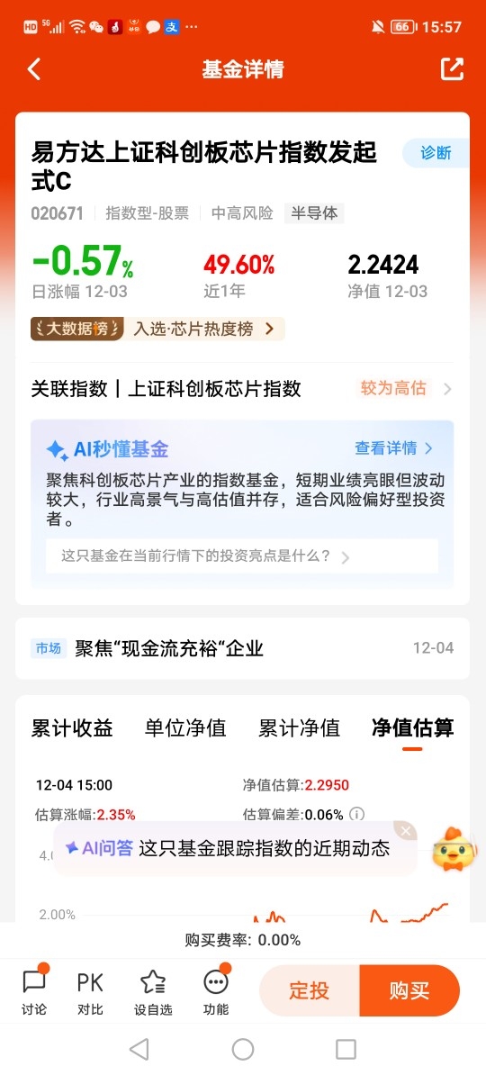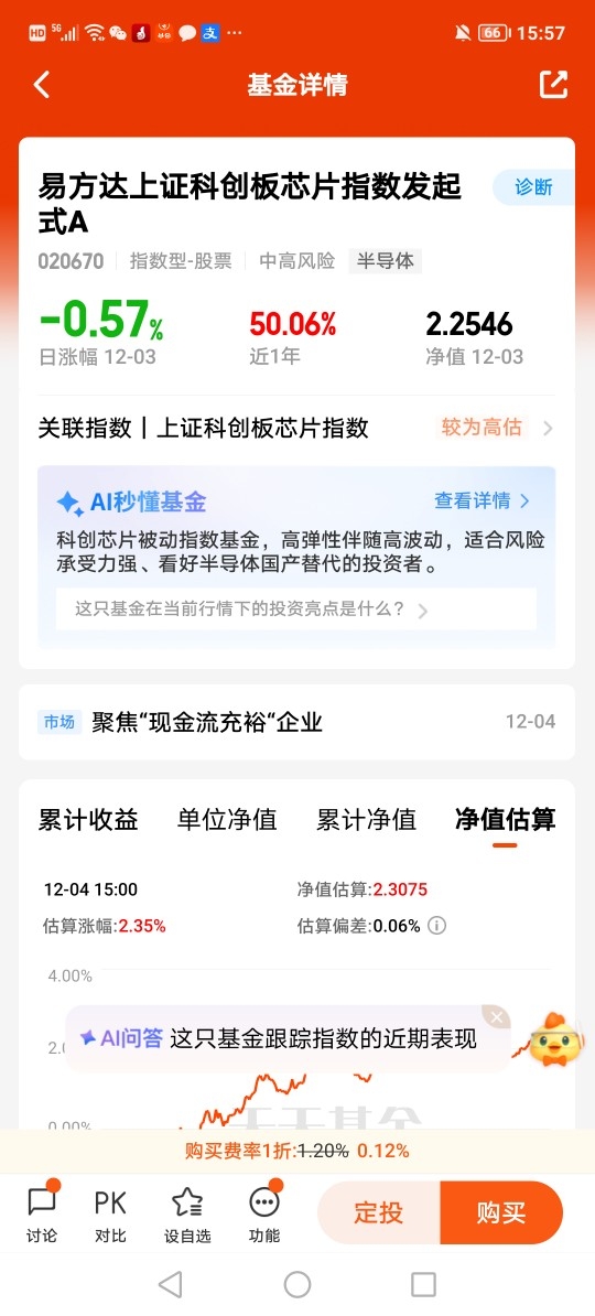 #观点搭子团火热招募中!# #热点话茬# 12月4日打卡第二十一天,周四科创芯片涨幅2%多,表现还可以,不过今日没加仓,打卡这么久了活动倒计时中,这段时间也是市场波动比较多的,所以通过打卡更加稳当了一些,之前频繁加变成现在减缓操作,也是在更好的拉低净值,如果算上今天涨幅,持仓浮亏5个点多一点,还算可以,所以不会过于着急去加,明年科技主线不变,就守护好自己目前的筹码,尽量更多的低吸而不是买在半山腰,所以今天选择不加仓。@易方达基金