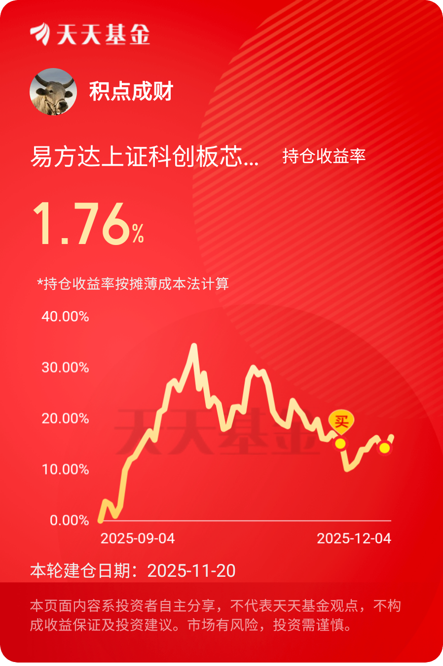 12月4日,发贴第21天。今天$易方达上证科创板芯片指数发起式C大涨2.22%,昨天加仓很及时!