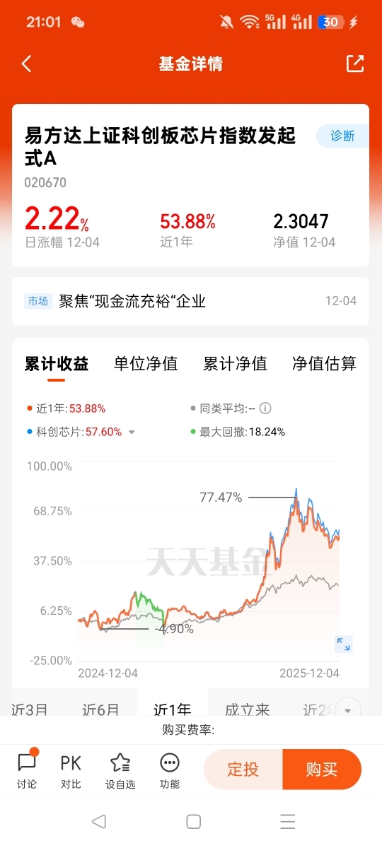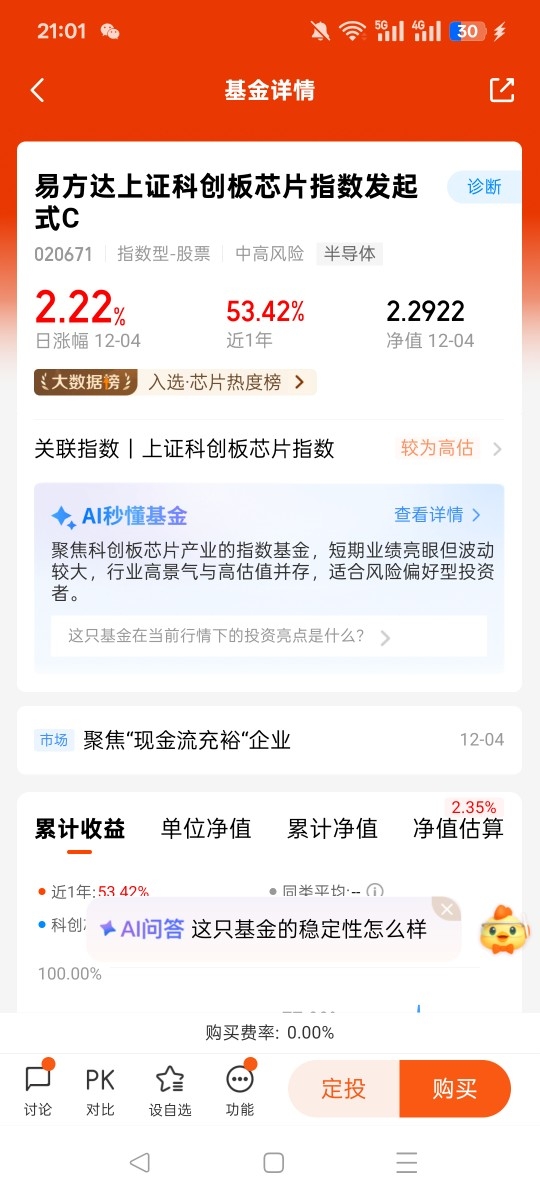 #观点搭子团火热招募中!# #热点话茬# 12月4日,第三篇,本月计划小额定投易方达上证科创板芯片指数 C。理由是当前持有债基仅能获取稳健收益,配置该基金可实现 “固收 + 科技成长” 的双线布局。C 类免申购费,费率更适配定投节奏。且 AI 算力需求爆发、国产替代加速,板块长期逻辑稳固,定投能摊薄前期波动成本,在不显著增加组合风险的前提下,提升整体收益弹性。@易方达基金