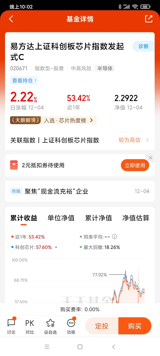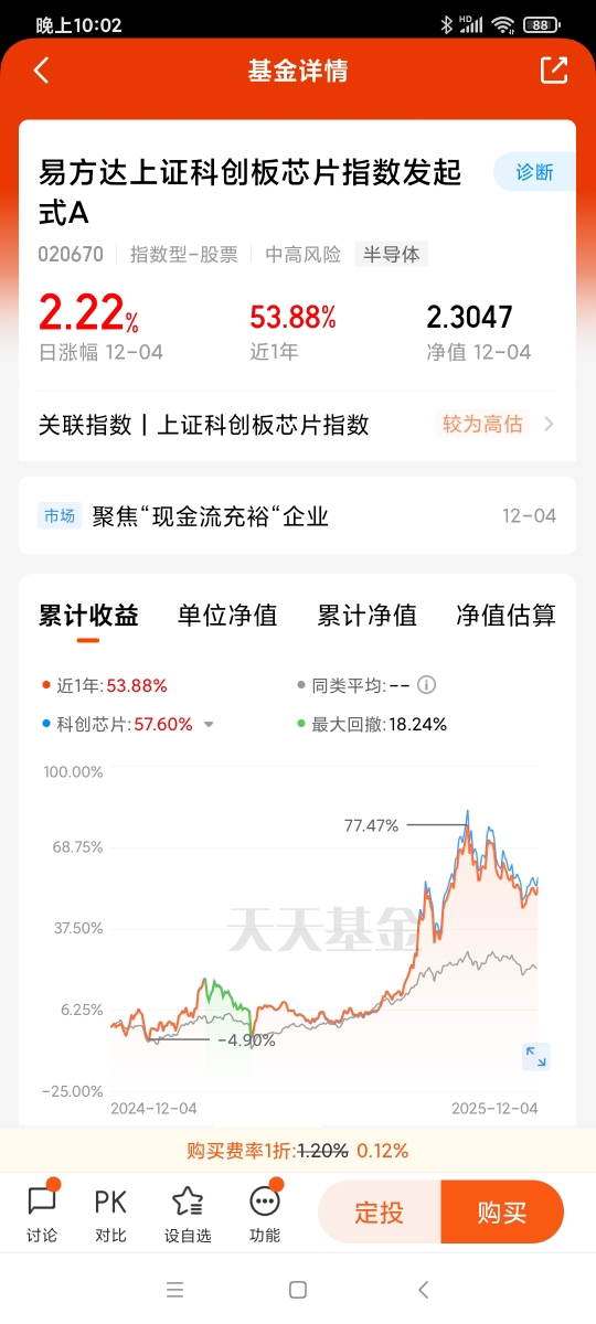 12月4日,今天市场普跌,但$易方达上证科创板芯片指数发起式C$涨了2.22%,
