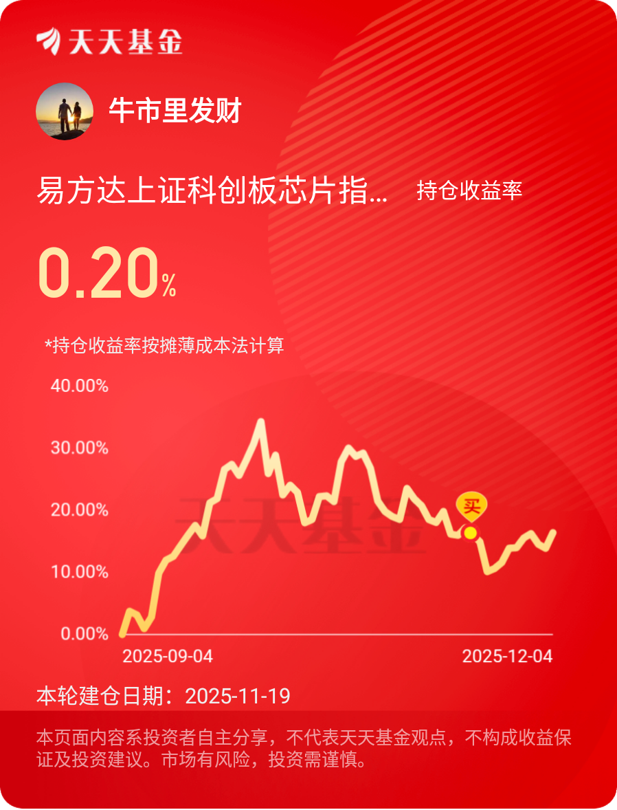 #热点话茬# #观点搭子团火热招募中!# 2025年12月4日,存储芯片进入新一轮涨价周期,海内外巨头持续加码AI算力研发与投资。在这样的利好驱动下,芯片行情备受期待。我刚买入$易方达上证科创板芯片指数发起式C$不久,今日它涨2.22%,我对它充满信心。该基金紧密跟踪科创芯片指数,能精准把握芯片行业发展脉搏。而且其C类份额持有满7天买卖0手续费,交易成本较低。随着行业景气度提升,相信它会给我带来不错的收益。#晒收益#