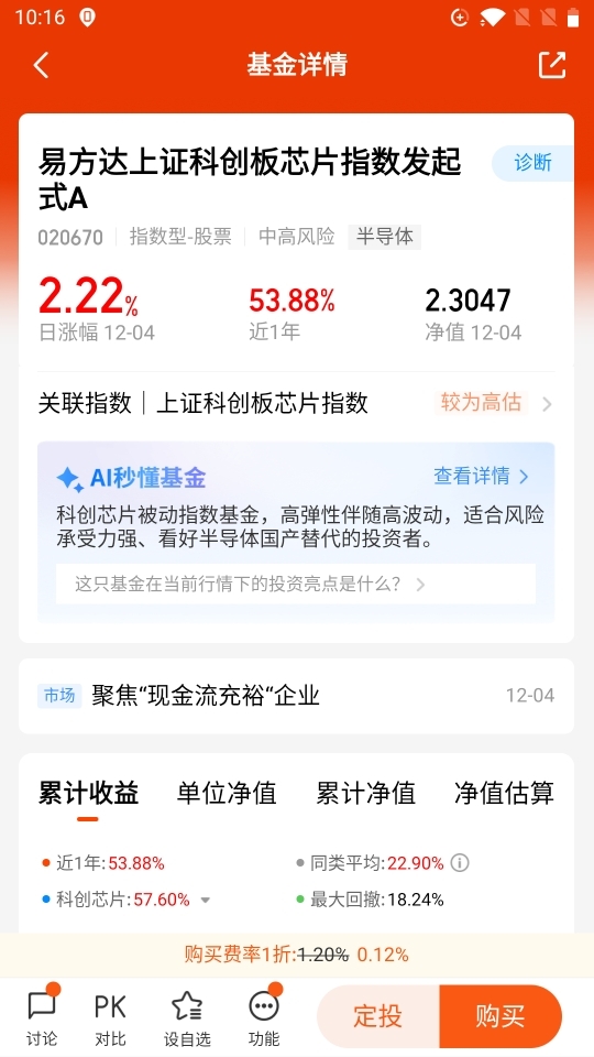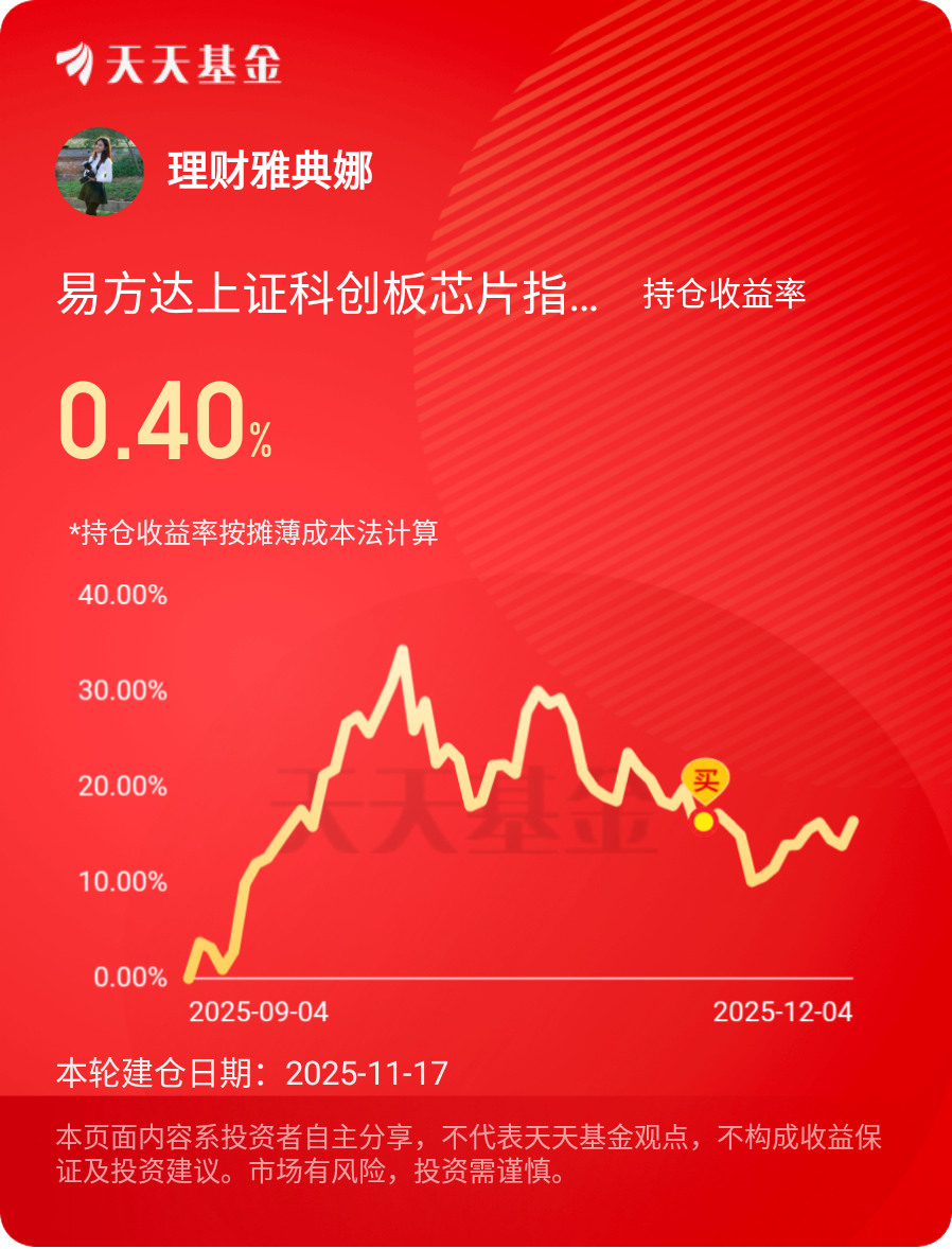 #观点搭子团火热招募中!# #热点话茬# 12月4日,存储芯片涨价与AI算力需求为市场注入强心针。我关注的$易方达上证科创板芯片指数发起式C$紧密跟踪科创板芯片龙头,今日芯片板块领涨,基金前十大重仓股中的中芯国际、中微公司等均有上涨,相信基金也能受益。行业正步入强复苏周期,国产替代空间广阔,基金聚焦半导体核心环节,是抓住这波科技红利的便利工具。短期波动不改长期趋势,我对接下来的行情保持期待。#晒收益#