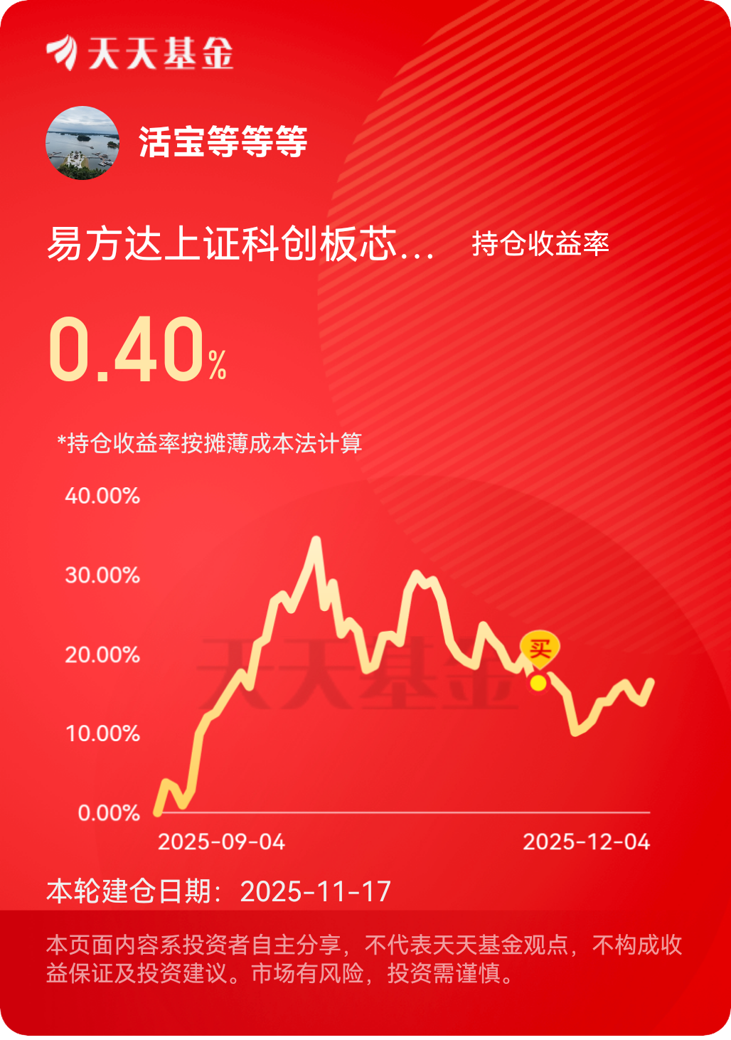 从优势来看,这只基金聚焦科创板芯片赛道,契合当前科技自主的主线;指数型产品的持仓透明,能直接分享板块成长红利。近期市场情绪回暖,加上半导体行业政策端的支持信号,后续板块的活跃度应该会持续。我打算继续持有观察,后续如果板块调整会考虑小幅加仓~$易方达上证科创板芯片指数发起式C$ @易方达基金 #晒收益#