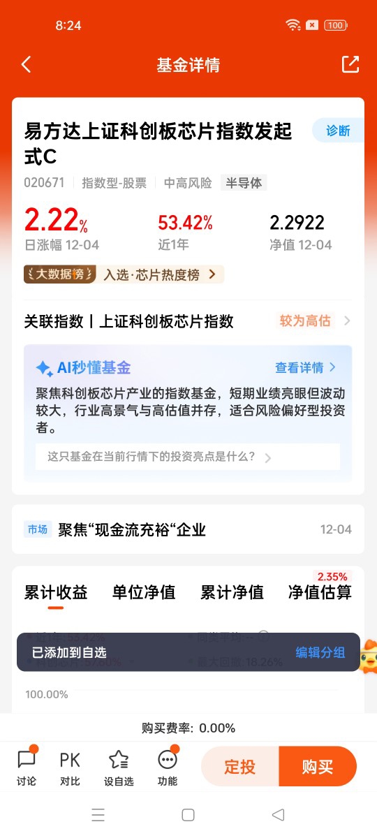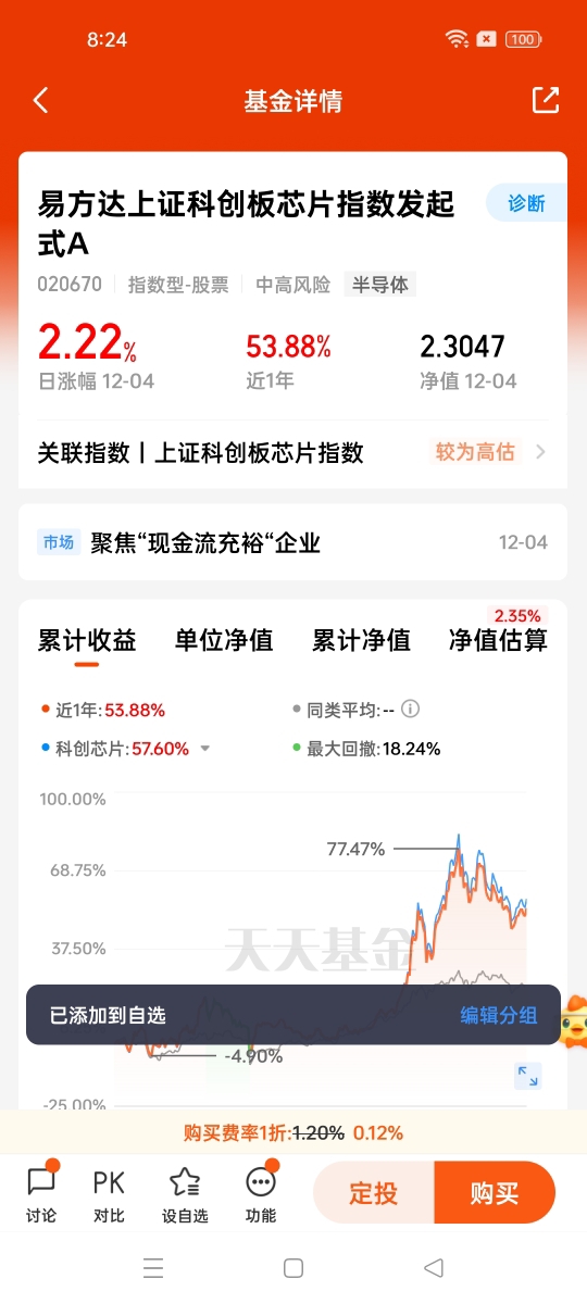 今日易方达上证科创板芯片指数C小幅收跌0.05%,净值报2.2911,在近期强势