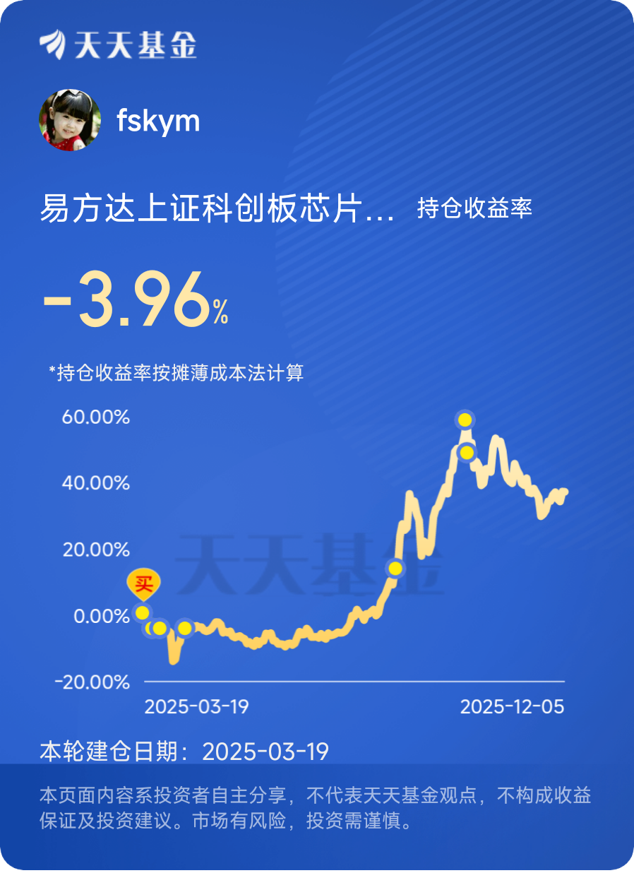 12月5日,第十六天打卡发帖,今日科创芯片微跌,$易方达上证科创板芯片指数发起式C$ 跌0.05%,科创芯片指数全天成交额倒是不算少,有543.42亿元,说明市场交易还挺活跃,就是指数没怎么跟着动,典型的“量在价不动”,最有意思的是今天还有个大事件,“国产GPU第一股”摩尔线程登陆科创板了,上市首日直接高开468.78%,开盘价650元,总市值一下子冲到了2822.52亿元,这爆发力也是没谁了,本来还以为这只新股能给科创芯片板块带波节奏,结果没想到板块整体这么“淡定”,该跌该涨各玩各的,看来新股的热度暂时还没完全传导到整个板块。@易方达基金 #晒收益#