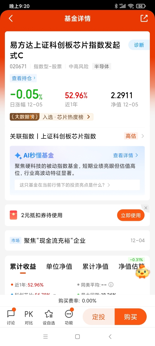 12月5日,今天$易方达上证科创板芯片指数发起式C$微跌0.05%,往后看,我依