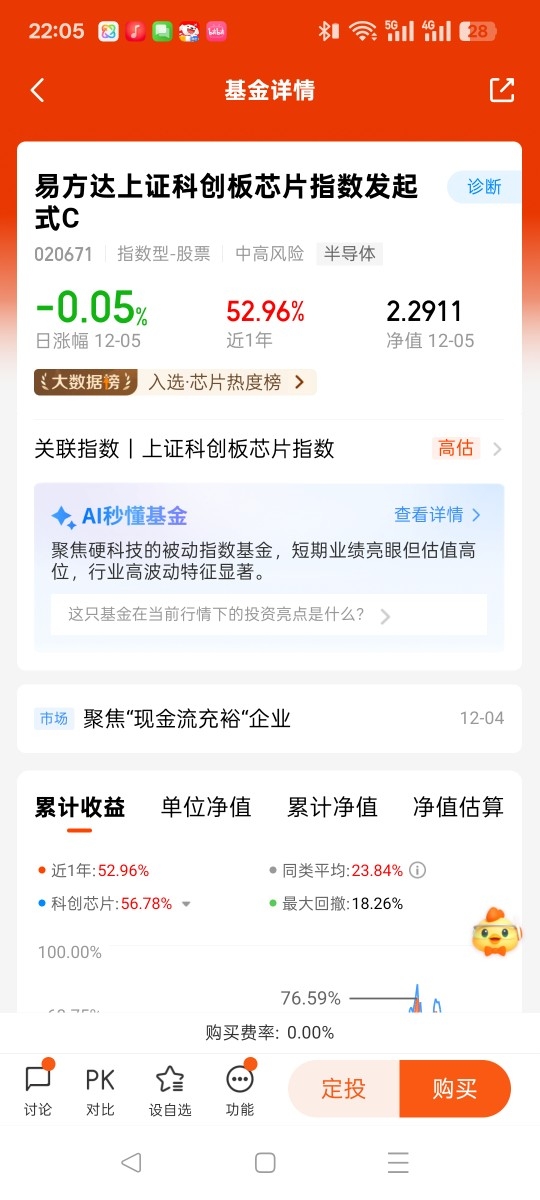 #观点搭子团火热招募中!# #热点话茬# 12月5日,第二篇,今日易方达上证科创板芯片 A/C(020670/020671)随板块震荡,A 类前一日净值涨 2.22%,近 6 个月涨幅达 48.91%。板块内个股涨跌分化,中科飞测领涨,存储芯片因 AI 需求缺口价格持续走高。结合我持有的易方达双债增强债券 A,该基金聚焦科创板芯片全产业链,高弹性特征能弥补固收资产收益上限不足,需关注估值高位下的短期波动风险。@易方达基金