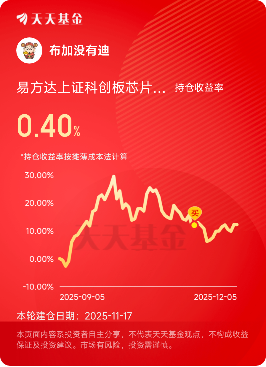 国产芯片产业正乘政策东风与技术突破之势崛起,“自主可控”的主线逻辑清晰且坚定,AI、智能汽车等新兴领域更催生持续增长的需求,科创板作为硬科技核心阵地,聚集了全产业链优质龙头企业,成长潜力十足。易方达上证科创板芯片指数发起式C 精准跟踪相关指数,一键覆盖芯片设计、制造、设备等核心环节,既规避了个股选股风险,又能充分享受行业红利,且C类份额免申购费、持有满7天免赎回费的友好费率,让普通投资者低门槛、低成本参与赛道。基于对产业长期趋势的看好和产品的优质特性,我已果断买入,将其作为布局硬科技赛道的核心配置。@易方达基金 #晒收益#