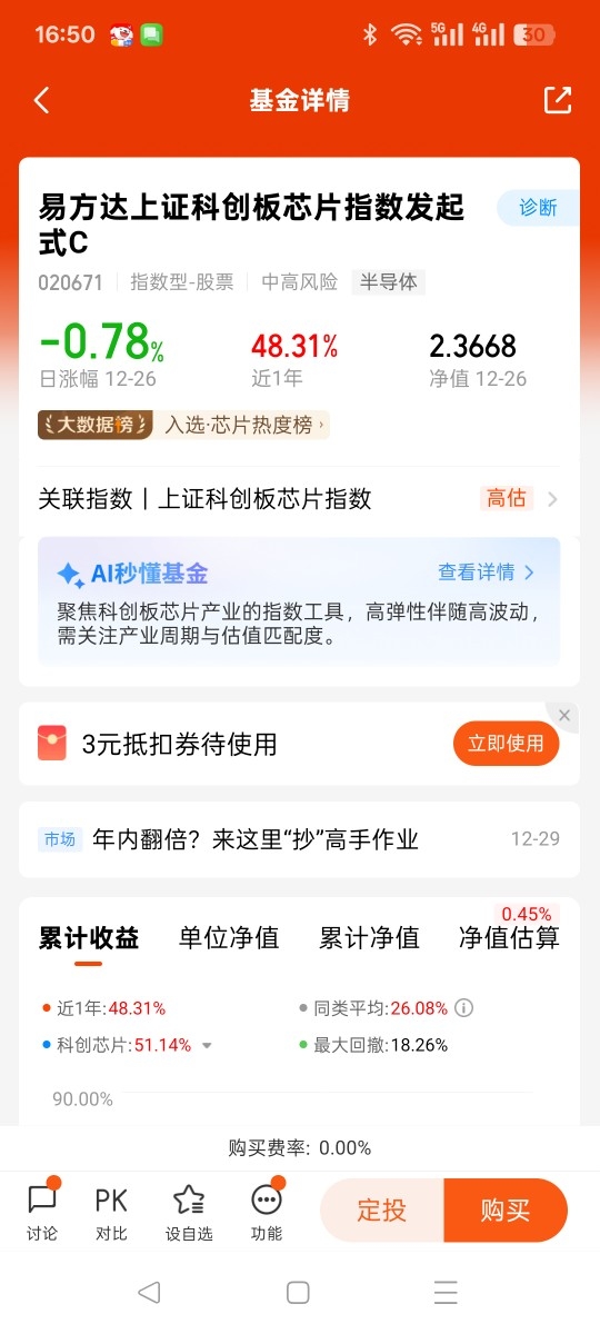 我的年度 pick 是$易方达上证科创板芯片指数发起式C$ 。理由很明确:一是芯片是科技自主可控的核心赛道,国产替代逻辑清晰,2025 年半导体设备、材料等环节业绩兑现度高,板块景气度持续上行;二是该基金聚焦科创板芯片企业,成分股多为细分领域龙头,成长性突出,契合我 “攻科技弹性” 的配置思路;三是对比其他选项,它既不像人工智能主题基金波动过大,也比科创 50、恒生科技等更聚焦硬核科技,能精准把握芯片产业的结构性机会。@易方达基金