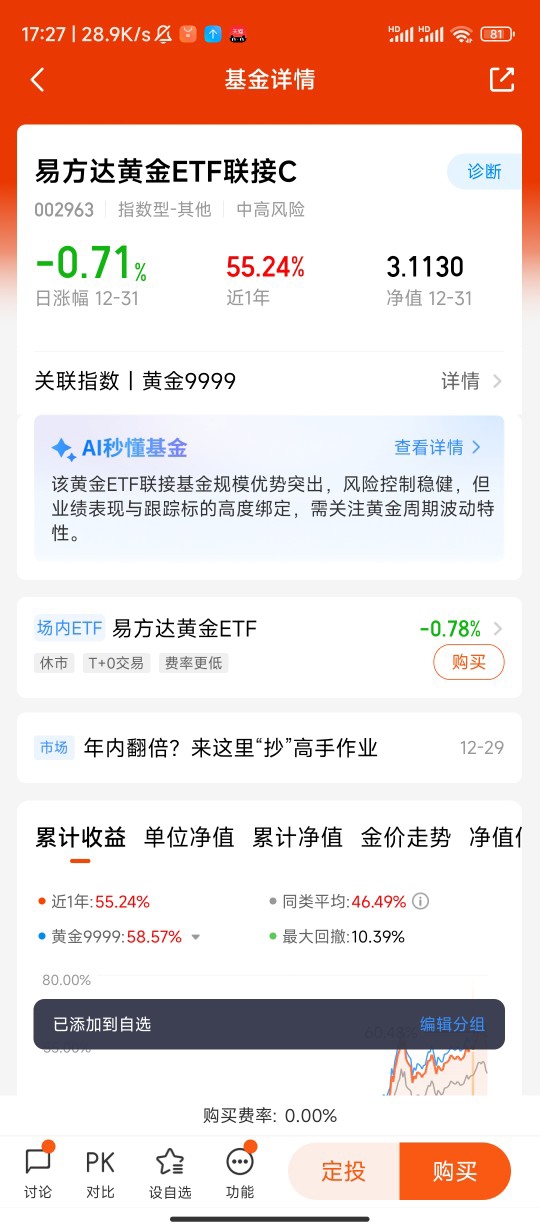 在去年四季度,易方达上证科创板芯片指数发起式C的净值经历了一波快速上涨。看着账户里的收益不断增加,我的内心开始变得浮躁起来,担心市场会出现回调,导致已经到手的收益化为泡影。于是,在基金净值还未达到我预期的目标价位时,我就匆匆选择了止盈,将部分仓位赎回。