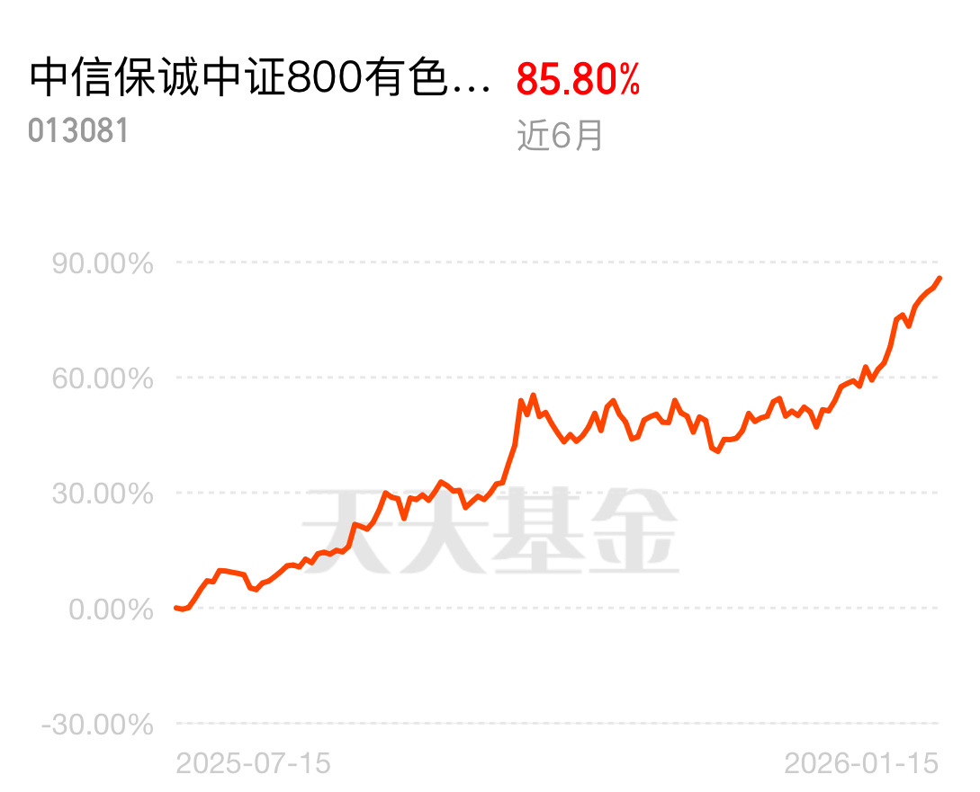 有色板块持续走强,五连阳稳步上涨,开盘领涨各大板块。中信保诚中证 800 有色指数 (LOF) C 布局稀有金属这类硬通货,近 6 月涨了 85.80%,赚钱效应拉满,讨论区福利红包还在,抓紧时间去领。$中信保诚中证800有色指数(LOF)C$