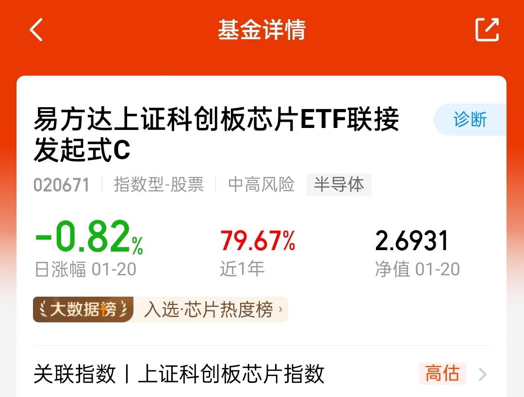 易方达上证科创板芯片指数C,近一年涨近80%,近一个月张静20%,持仓聚焦芯片产业链核心企业,如海光信息、澜起科技、中芯国际等,从设计、制造、设备全链条都有。看多理由:国产替代加速推进,政策红利持续释放,技术提升,综合考量,半导体板块继续看涨。