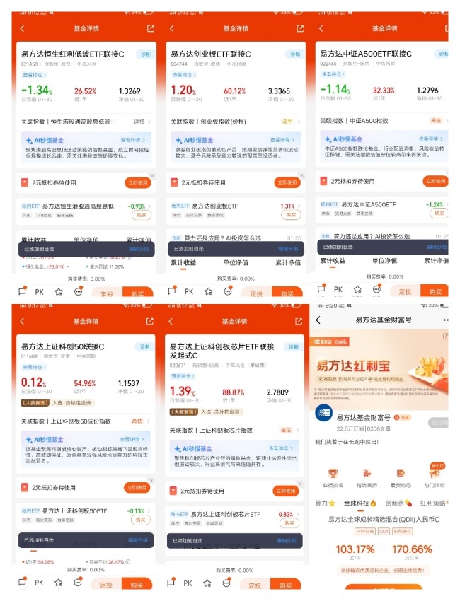 而$易方达上证科创50联接C$ 与$易方达创业板ETF联接C$ ,则构成了组合的“成长双支柱”。前者紧密跟踪上证科创板50指数,2025年三季度45.97%的区间收益率,展现了科创板龙头企业的活力,虽四季度受市场调整影响出现-9.39%的回撤,但196.12亿元的资产规模(数据来源:易方达基金官网,2025.12.31)提供了充足的流动性保障;后者作为成立近9年的“老基”,2025年35.68%的近一年回报率(数据时间2026.1.29)兼具稳定性与成长性,持仓中宁德时代、迈瑞医疗等标的,平衡了科技板块的波动风险。