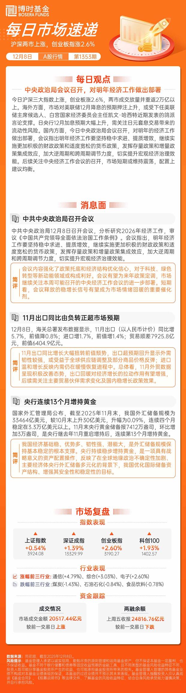 【博时市场点评12月8日】沪深两市上涨,创业板指涨2.6%