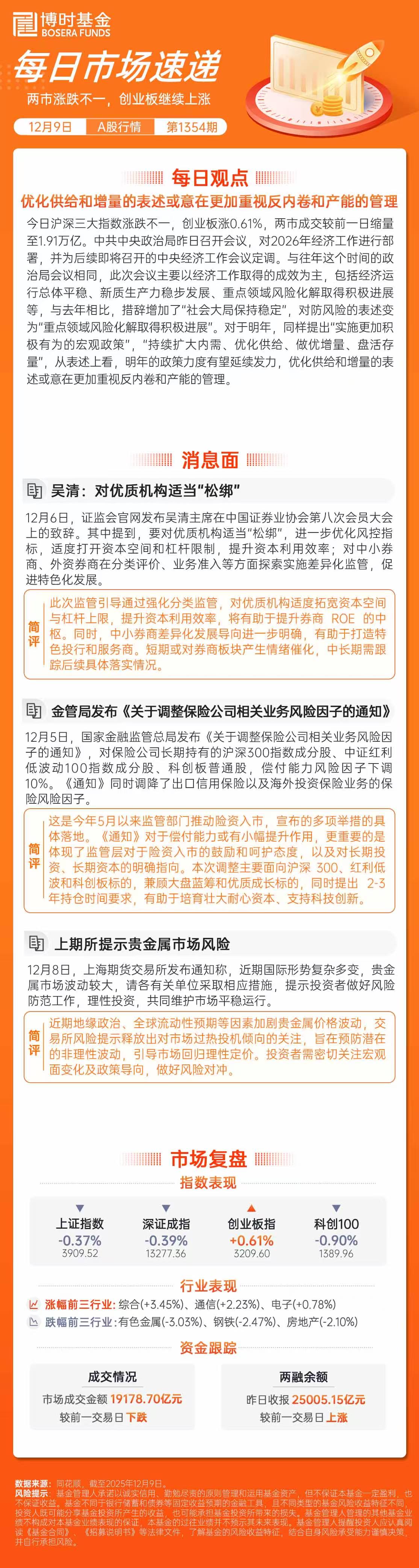 【博时市场点评12月9日】两市涨跌不一,创业板继续上涨