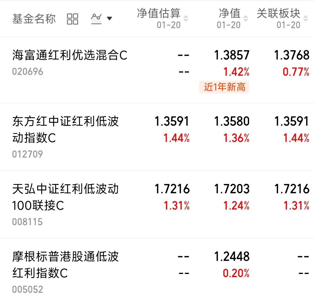 今日大盘震荡调整,三大指数集体走低,不少板块跟着回调。这种弱势行情里,红利板块的稳定性格外凸显,表现十分抗打,既能带来稳定现金流,又相当于给我的投资加了一层安全垫。$海富通红利优选混合C(OTCFUND|020696)$上涨1.42%。