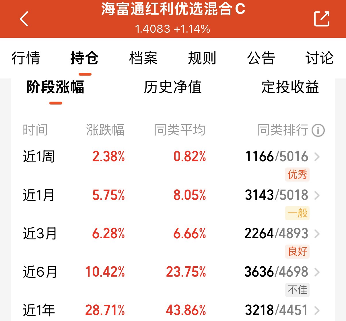 大盘分化,接下来可能要高低切换了,昨天的白酒大阳线就预示着市场可能会有新的热点出现,野百合也会有春天,从目前的走势看,指数高位震荡其实还没有结束,我觉得还需要时间修复,所以这个位置我还是考虑防御板块做布局,加一份$海富通红利优选混合C$ 近期表现优秀,这一周已经连涨四天,加上今天要冲刺五连涨了,虽然不像近期的资源股那么激进,但是长期下来体验感相对舒适。
