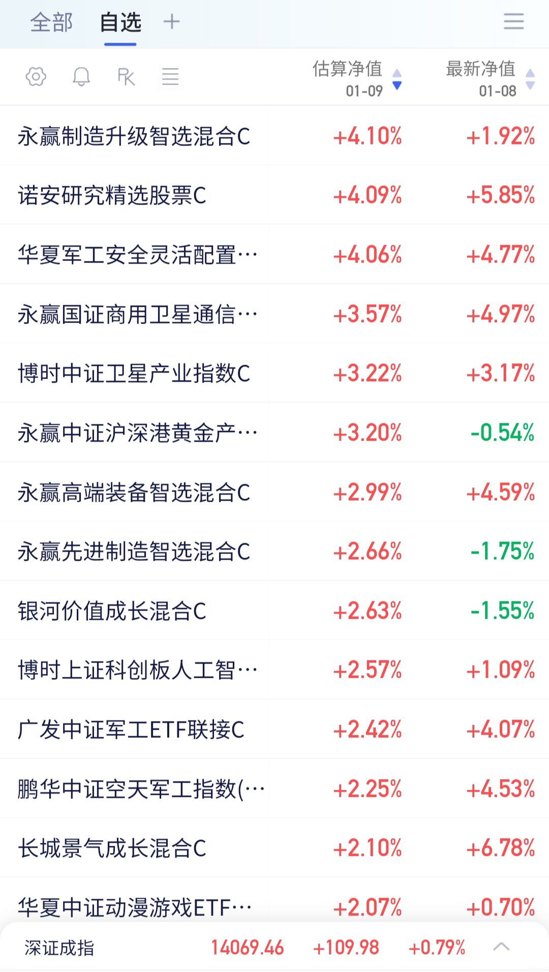 以下是部分自选基金当日收益估算(1:25分左右数据):