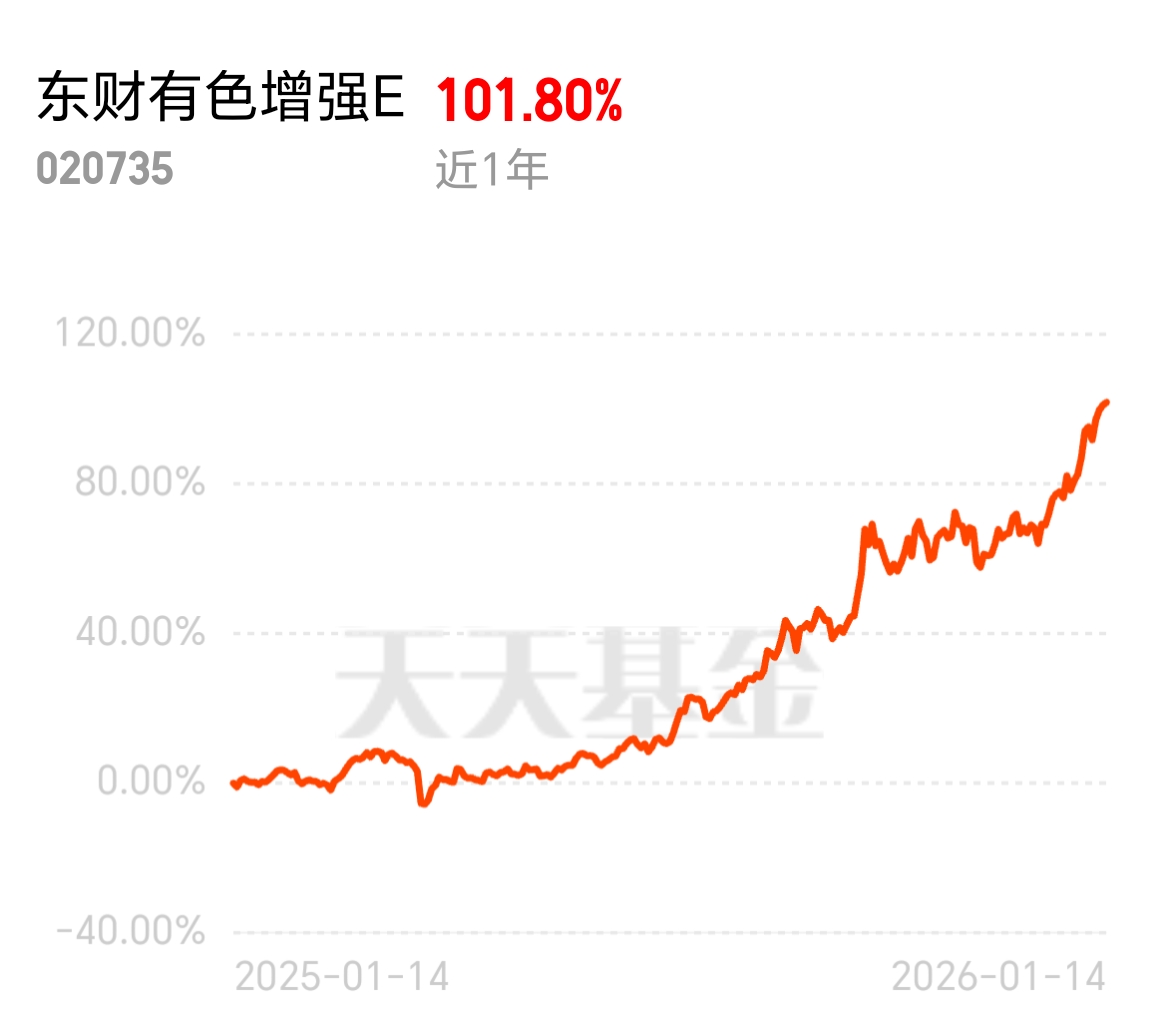 全球央行增持黄金,贵金属需求持续走高,有色板块成投资热点!东财有色增强 E 近 1 年涨 101.80%,卖飞的痛不想再尝,筹码攥紧不放坚定持有,跟着好行情稳稳赚钱~