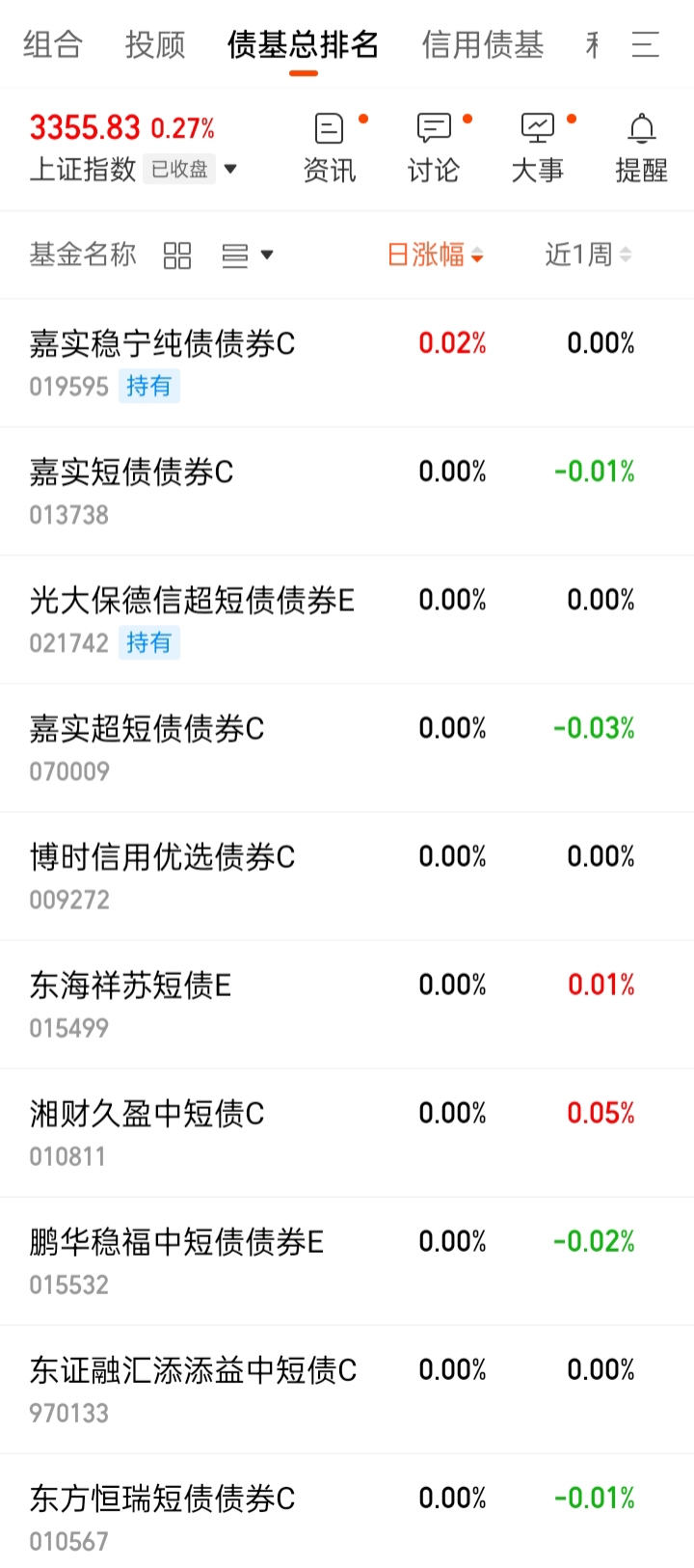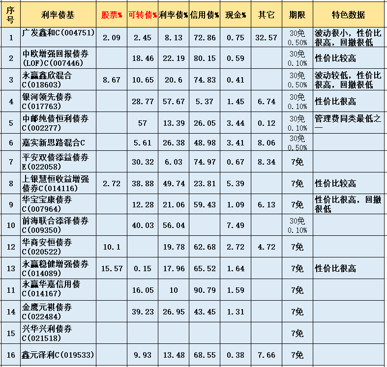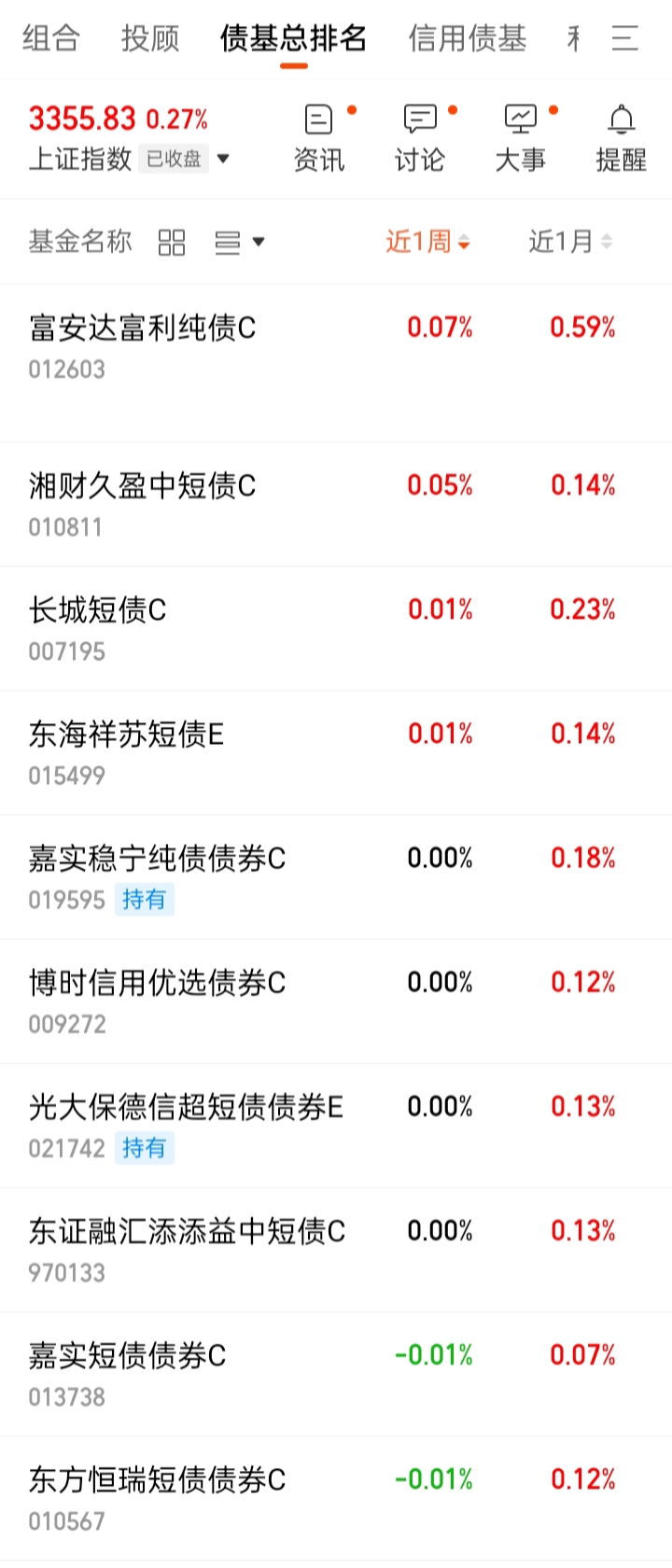 6、仓位配置:债基近1周平均收益全面低于货基,如仓位较重可以选择止盈减仓。控制仓位。