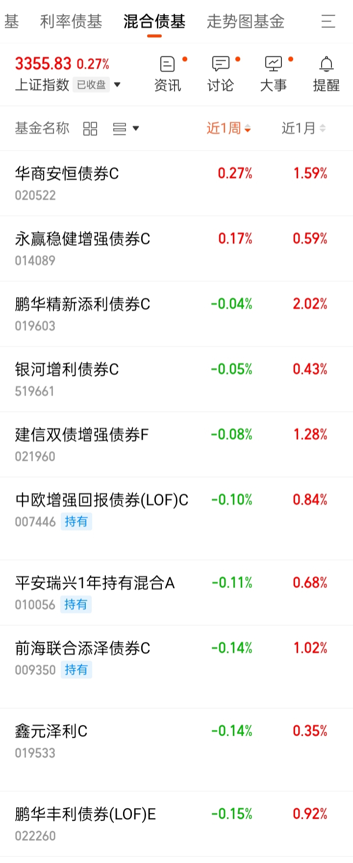 混合债基近1周平均收益受债基影响,开始低于货基,可适量逢低买入或定投。