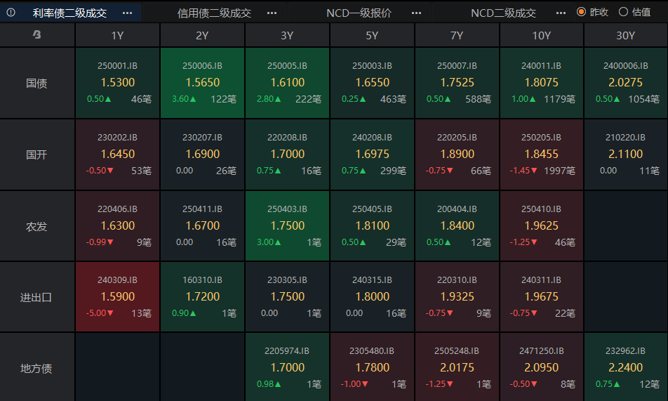 银行间市场主要利率债收益率与债基涨跌是反向关系,越下行越好。