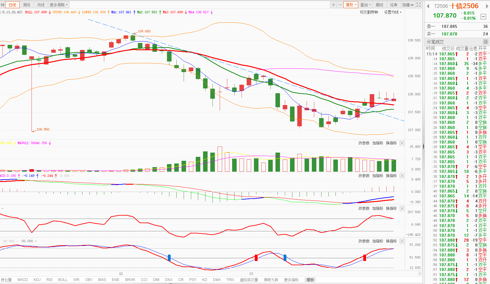 技术指标:今天10年国债期货低开后冲高回落,跌0.01%,日K线仍在5、20日均线之上。