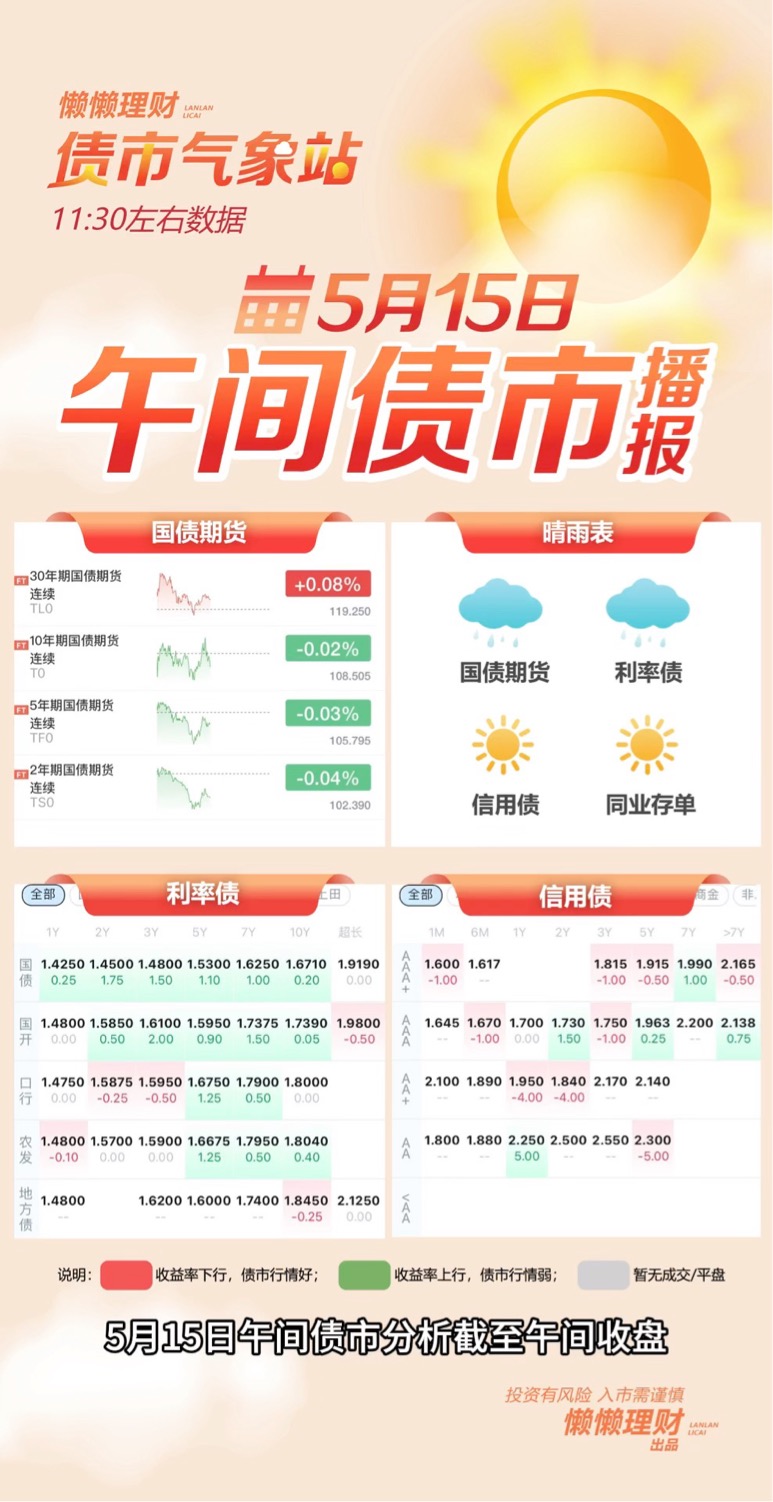 5月15日午间债市分析:截至午间收盘国债期货小雨天 ,利率债小雨天,信用债小晴天,同业存单小晴天。早盘股债均显弱势,沪指由3400点回落至3390点附近震荡,国债期货小幅高开,盘中震荡走弱全线翻绿,近午间收盘小幅反弹。债市收益率早盘普遍小幅上行,整体曲线走势仍平坦,10年国债收益率运行在1.67%一线。券商为卖盘主力,基金为10年国开债主要卖方,银行、保险买债力量逐步增强。关注我,每天债市行情不迷路!#央行降准降息!市场会如何反应?# #债券基金#