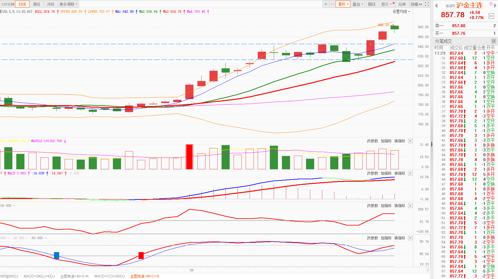 沪金主连:涨0.77%,日K线在5日均线之上。今天沪金上涨,盘中高开低走,上升动能减弱,近期大幅上涨后,存在一定的获利回吐压力,可能需要整理一下,仓位重的可逢高部分止盈,配置盘或仓位轻的逢低适量买入。